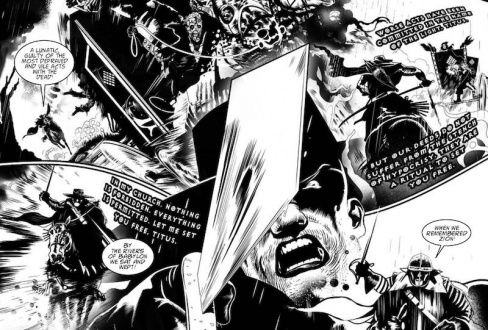 Moore: Yes, some visual elements have to be repeated here and there because some readers may not remember or have seen the previous issue, so you have to keep echoing things and especially if that component is to become important or of use later. In a book the reader can always flick back and see where that ‘thing’ came from, or the pace is not broken by several weeks of issues. I think the intensity of what I drew is lost a little with only six pages a week because the whole thing glimpsed, in a book it will flow better.