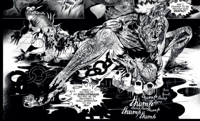 Moore: I did alter my style significantly. In short the style is supposed to be what an artist, in the 1940’s, might have drawn if he had been given the brief to draw a comic based on an old German Expressionist horror film called The Divisor – that was trick I tried to play on myself. I watched many old UFA films such as The Cabinet of Dr. Caligari, Nosferatu, M. Each morning as I drew I would run the Swedish masterpiece The Phantom Carriage on my ipad, so it was always at the corner of my eye. The Criterion version has a particularly haunting soundtrack and the atmosphere it generates is fantastic. There are direct visual links, to my eye, between TPC and David Lynch and, very famously, Stanley Kubrick found his ‘Here’s Johnny!’ scene in TPC.