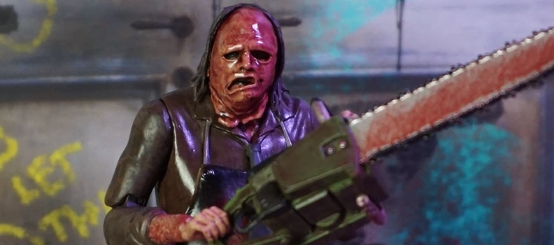 The four-inch figures–presented in 1/18-scale with 15 points of articulation–come complete with two pairs of hands and (of course) a chainsaw.