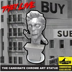 Horror toy fans will be particularly interested in the “Bruce the Shark” plush from Jaws and the ultra-cool “Candidate” chrome statue from They Live. Both are up for pre-order, with intentions to ship in August. The Consolation-Con exclusives will continue to be available until the pieces are sold out!