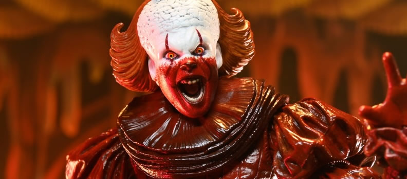 The official description of the figure provided by NECA reads “From the twisted world of Stephen King and the HBO series IT: Welcome to Derry, NECA unleashes Ultimate Blood Pennywise! The nightmare-inducing Dancing Clown is back to terrorize Derry—and your shelf—as a fully articulated Ultimate action figure. Standing in 7-inch scale, Pennywise features gruesome, blood-soaked deco and interchangeable heads and hands. Comes in collector-friendly window box packaging with opening front flap.”