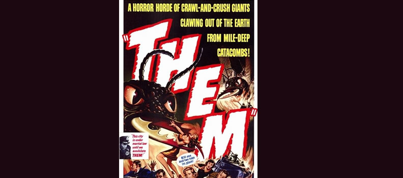 In the original Them!–directed by Gordon Douglas from a screenplay by Ted Sherdeman and Russell Hughes–a large colony of irradiated ants are discovered in the New Mexico desert–and they become real pests of themselves when two queen ants and their consorts escape to establish new nests. What a picnic they could ruin!