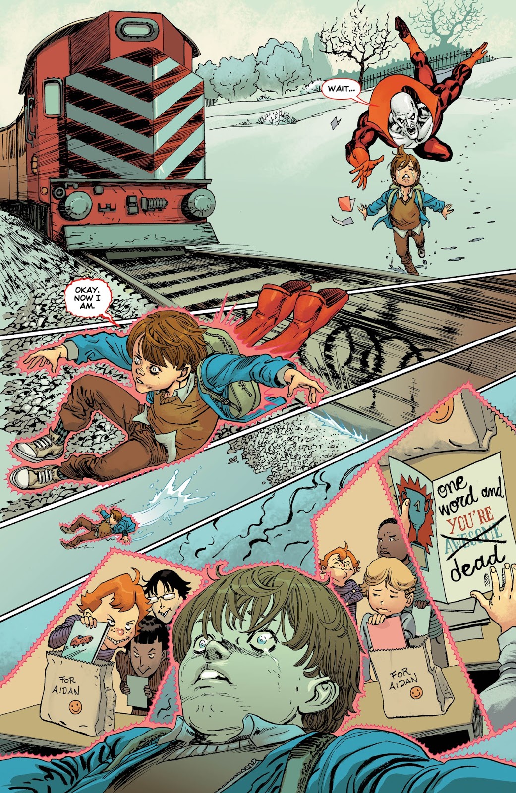 Dini follows in Vaughan’s footsteps more so than Adams, as the Deadman in “Be My Valentine” is of a more sympathetic, caring variety than past versions of Boston Brand. Dini is well-known for crafting stories with “heart” and this tale of an elementary school Valentine exchange gone wrong is both poignant and hilarious, as the ghost assists a young man with a healthy dose of self-esteem and some much needed revenge against some school-yard bullies. Guillen March’s artwork wavers between the epic and cartoonish, striking the right mix for a story that features “real-life’ struggles with human nature as well as floating little boys.
